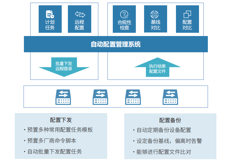 自动化配置系统支撑企业进行专业的配置管理,可一键批量下发多种配置任务,自动处理不同厂商命令差异;支持计划任务,支持自定义脚本;其配置自动备份功能提供配置对比、合规性检查;支持配置任务审核,并自动记录所有日志。自动化配置系统全面提升企业配置管理的质量、效率及安全性,实现全自动配置管理,解放运维人员的双手。