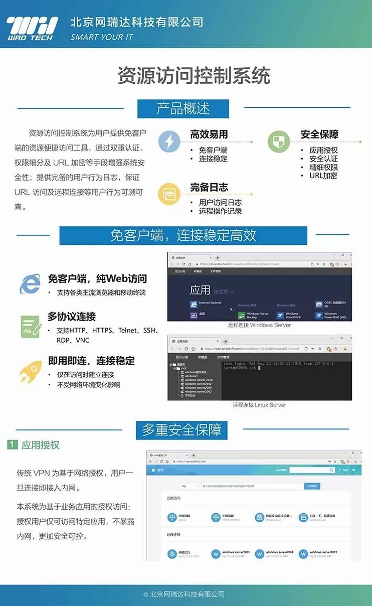 资源访问控制系统为用户提供免客户端的资源便捷访问工具,通过双重认证、权限细分及URL加密等手段增强系统安全性;提供完备的用户行为日志,保证URL访问及远程连接等用户行为可溯可查。