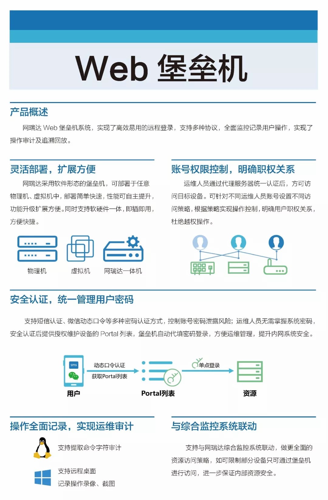 网瑞达Web堡垒机系统,实现了高效易用的远程登录,支持多种协议,全面监控记录用户操作,实现了操作审计及追溯会放。
