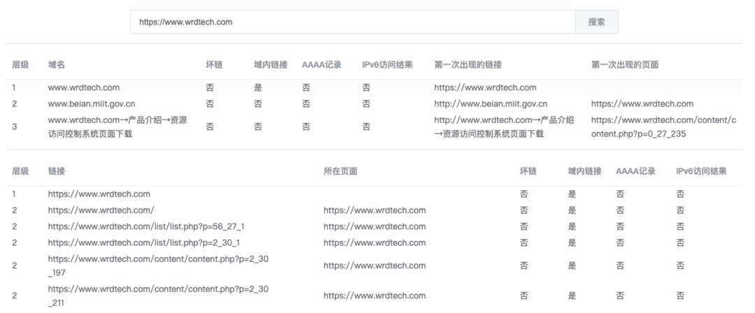 筛查结束后,将为您生成详细结果报表:给出建议升级的域名/链接列表,最终由您来确认哪些需要实现IPv6升级。