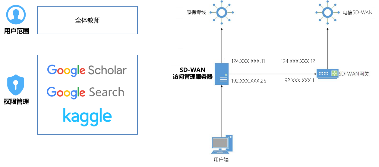 本方案能够根据用户IP地址划分电子资源的访问权限,进一步确保访问的安全性。例如仅允许教师组的IP地址通过SD-WAN访问国外电子资源。