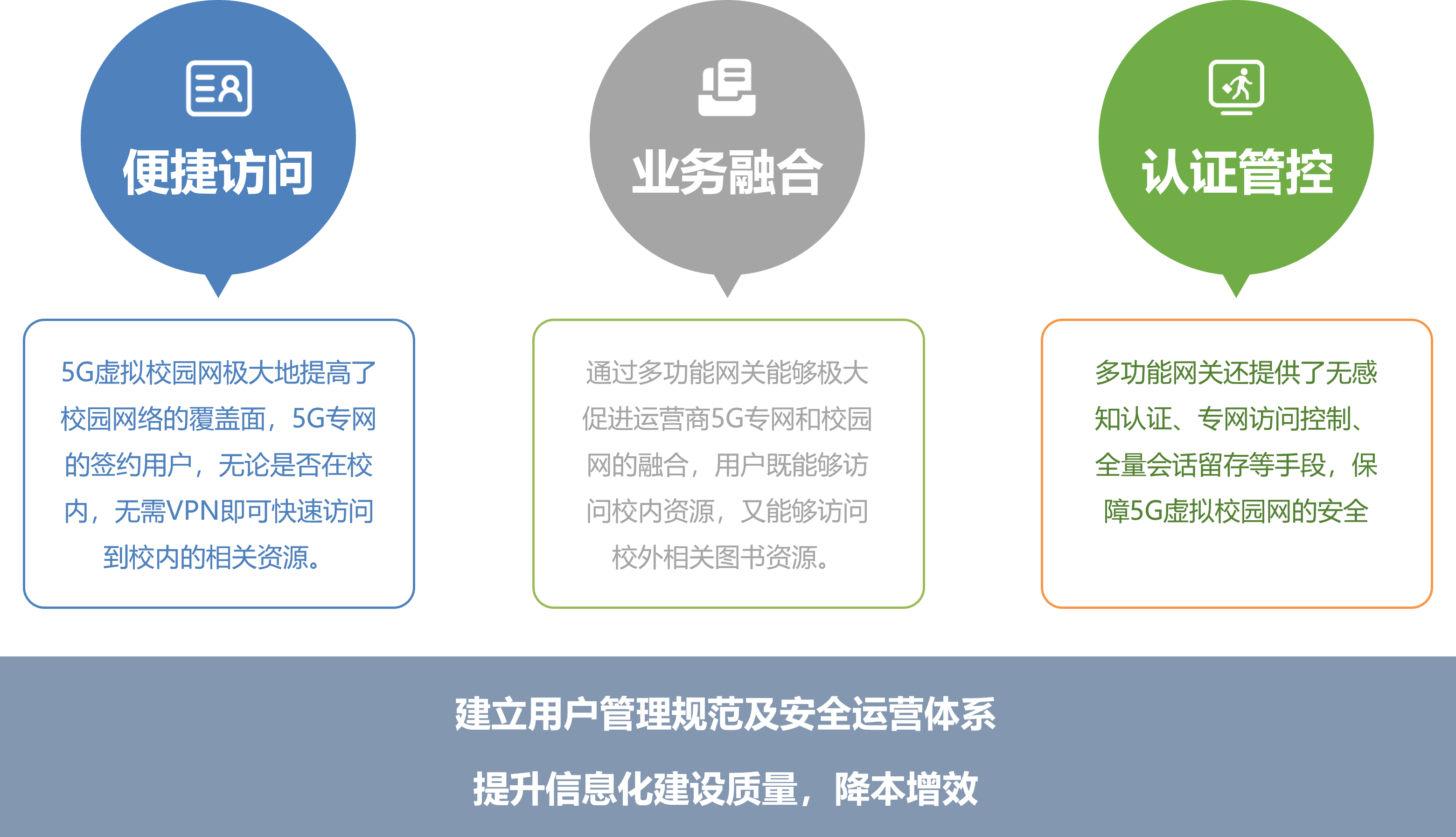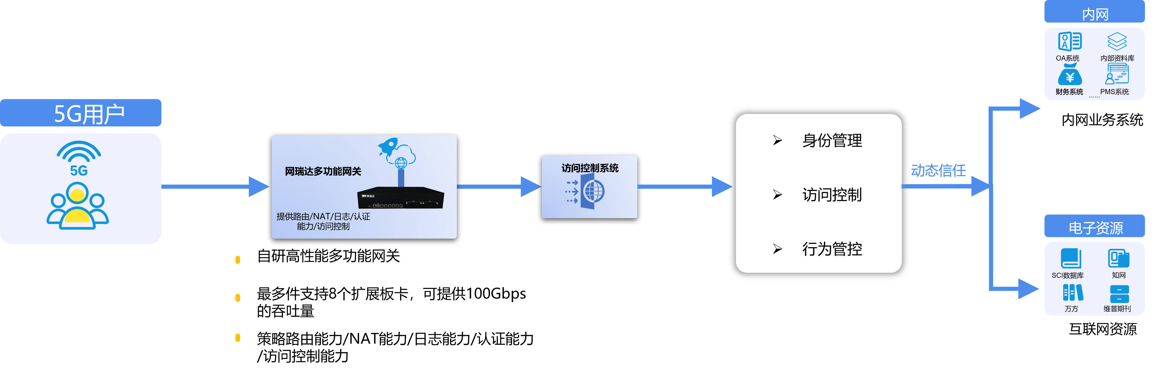 进入到校内的数据包通过网瑞达多功能网关进行可信流量转发,再由访问控制系统进行身份鉴别后对校内资源进行访问,用户全程无感知,极大提高用户访问便捷性。通过多功能网关能够极大促进运营商5G专网和校园网的融合,用户既能够访问校内资源,又能够访问校外电子资源。